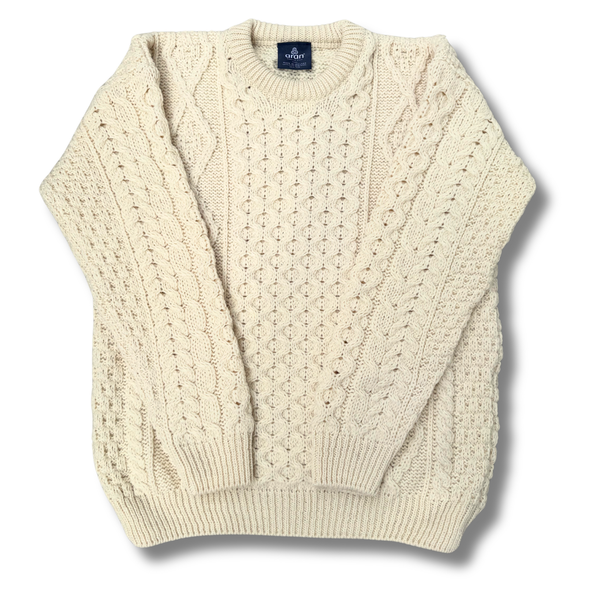 A staple of a true New England wardrobe is an Irish-knit sweater. We had them from the time we were two until the time we stopped growing, passing them down and down and down. The creamy off white worsted wool paired with my Scottish kilts, Calvins in high school and my paint splattered khakis today is the centerpiece of any outfit.