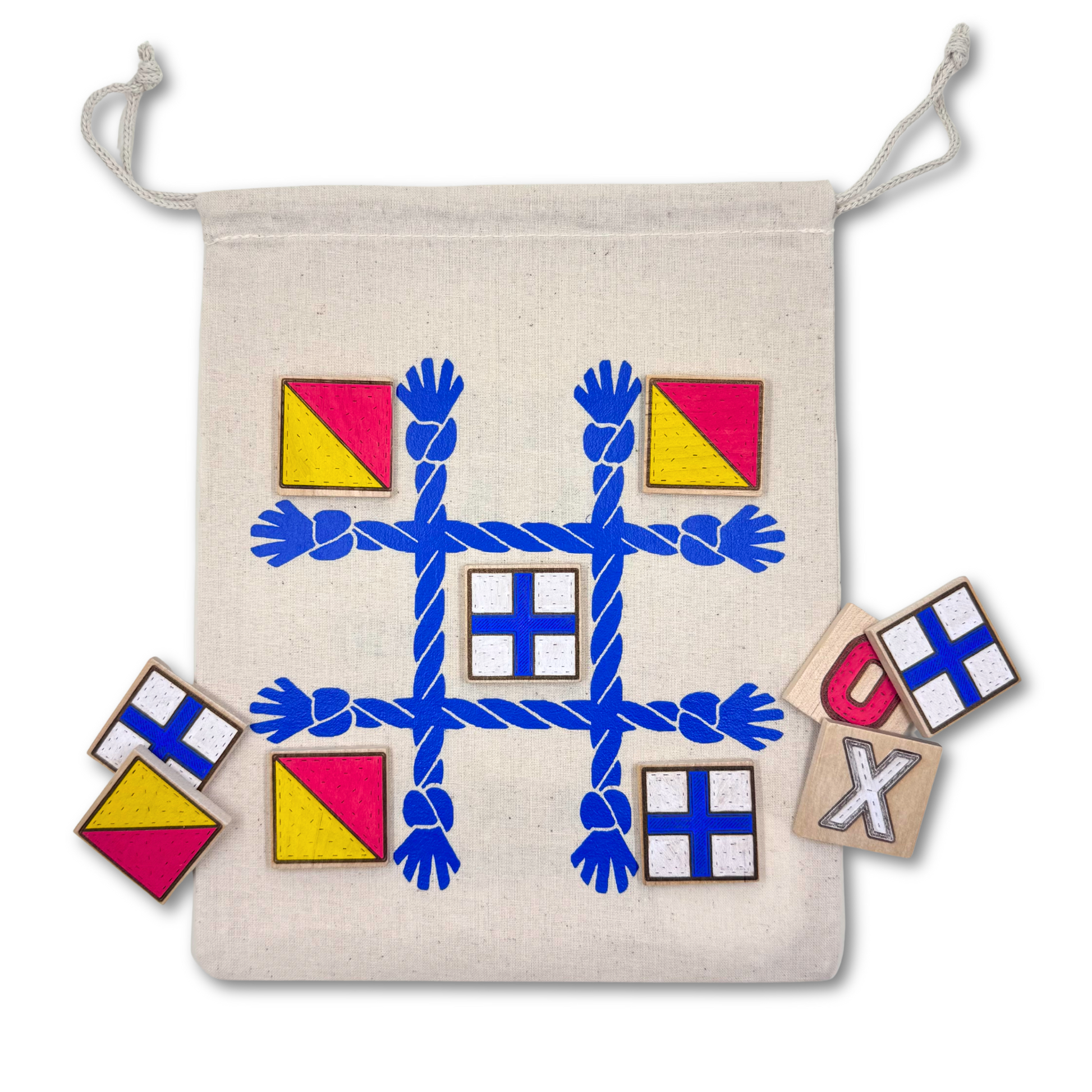 A nautical twist on the classic game of Tic-Tac-Tow this game is handmade on the Cape and comes with everything you need to play many rounds of this strategic game. The game pieces are made from wood and have the nautical flag symbols for X's & O's on one side, and the more traditional X's & O's on the other. The pieces fit into a cotton muslin drawstring bag that also serves as the game board.